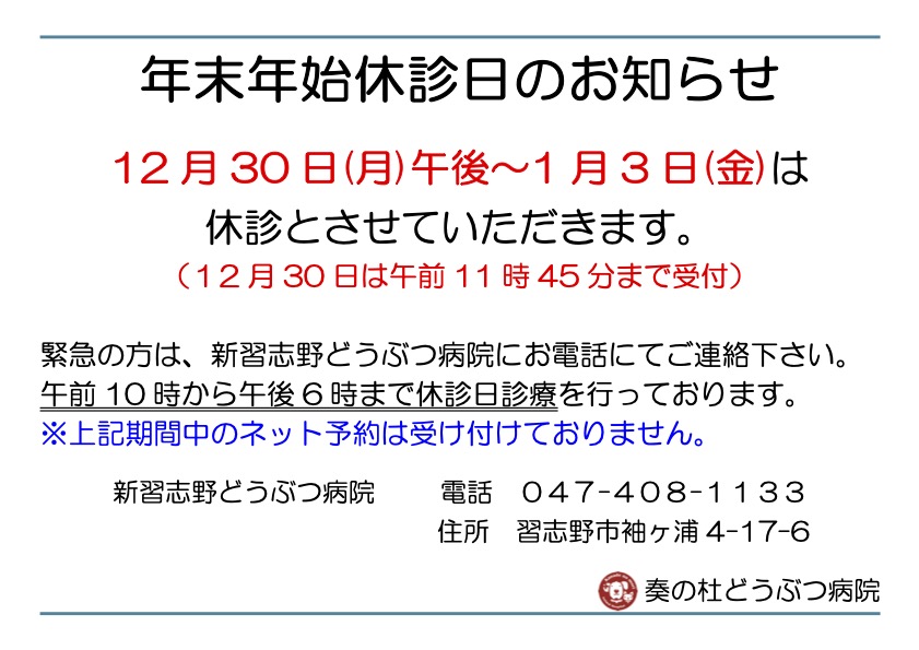12月30日(月)午後〜1月3日(金)までは休診とさせていただきます。